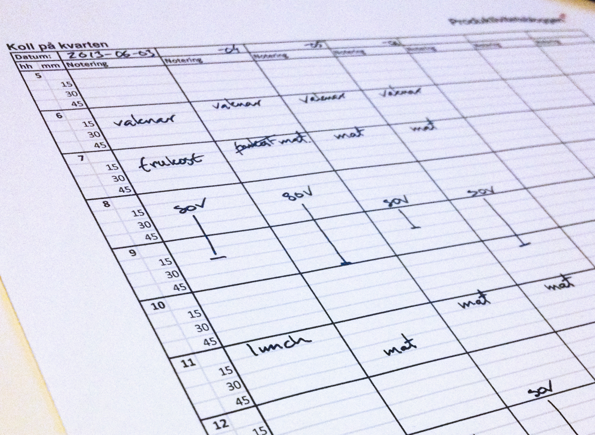 För att kunna ta oss dit behövde vi först förstå var vi stod för tillfället. Därför tog jag fram en logg som hjälpte oss få koll på vad som hände när med en kvarts noggrannhet. Lagom noggrant för att kunna överblicka ett dygn.